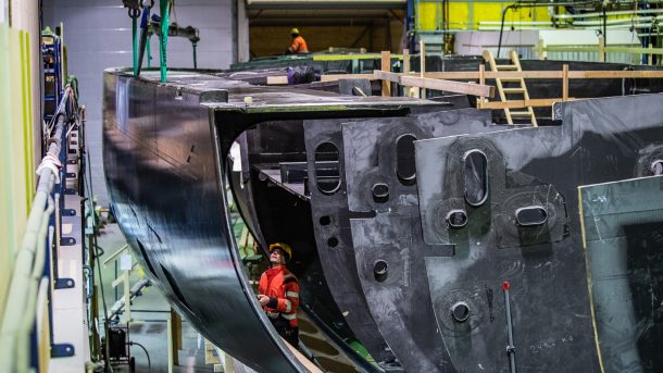 Follow the construction stages of the Baltic 146 Custom, the third largest yacht, by volume, built by Baltic Yachts. A recent update showed how one of the topsides sections was manoeuvred out of the build facility, removed from its mould and then craned into position…